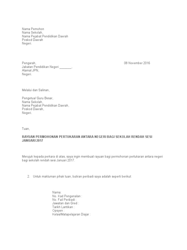 Contoh Surat Rayuan Pertukaran Guru Antara Negeri