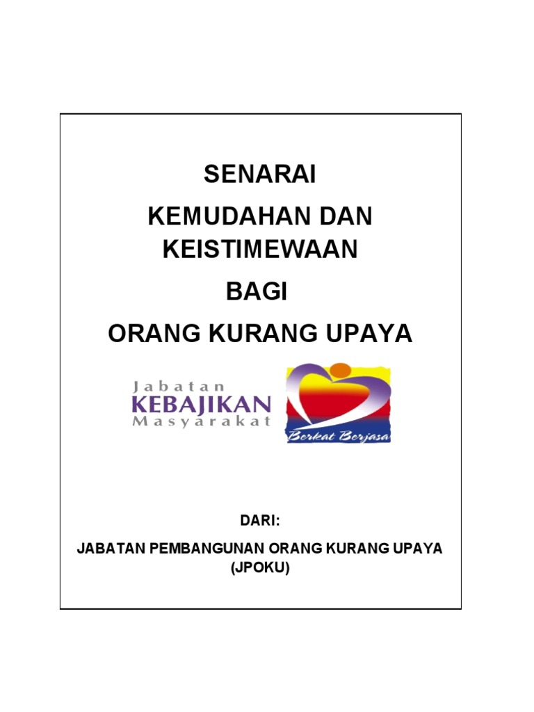Jabatan pembangunan orang kurang upaya. Borang cadangan usul majlis bersama jabatan. Dasar warga emas negara. Pewujudan jabatan pembangunan orang kurang upaya jpoku telah diluluskan pada 1 september 2008 dan mula beroperasi pada 1 mei 2009. Shahir ilim kampus utama bangi selangor.