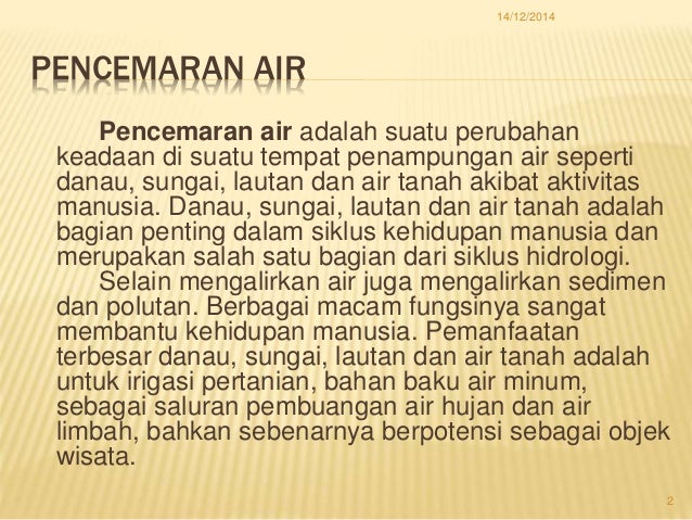 Polusi air atau pencemaran air adalah suatu perubahan keadaan di suatu tempat penampungan air seperti danau sungai lautan dan air tanah akibat aktivitas manusia. Sedangkan polutan itu bahan yang menyebabkan terjadinya pencemaran lingkungan contohnya asap sampah bahan berbahaya dll. Perbedaan polusi dan polutan. Berdasarkan sifatnya dalam mempengaruhi kenyamanan hidup manusia jenis jenis limbah dibedakan menjadi 3 yaitu limbah biasa limbah bahan berbahaya dan beracun limbah b3.