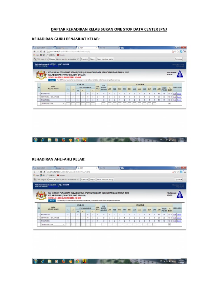 Daftar Kehadiran Kelab Sukan One Stop Data Center Jpnj