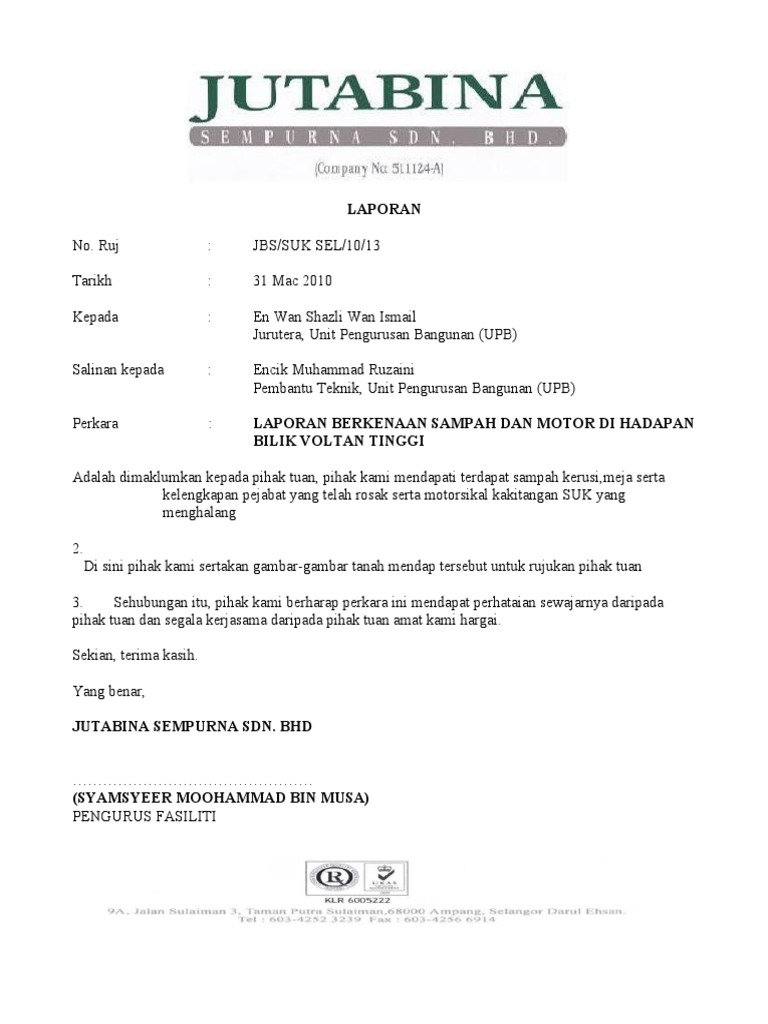 Laporan Sampah Dan Motor Di Hadapan Bilik Voltan Tinggi